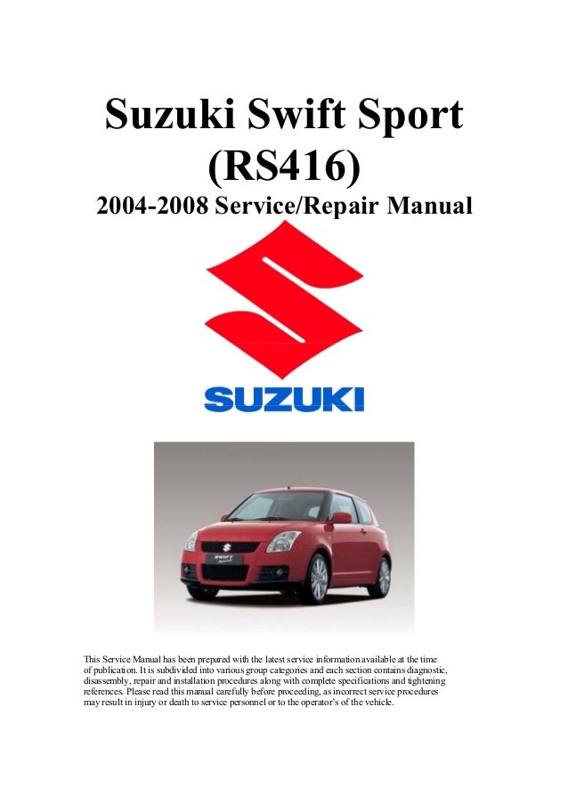 8/29/19 · Suzuki Swift Sport Rs416 Service Manual 04 08 pdf manufactured by the company SUZUKI presented for you in electronic format Page size 612 x 792 pts (letter) (rotated 0 degrees) This manual can be viewed on any computer, as well as zoomed and printed, makes it easy to diagnose and repair problems with your machines electrical systemDownload manual repair rs416 service sport suzuki swift SUZUKI SWIFT SPORT RS416 0408 FULL WORKSHOP MANUAL November 23, 14 rebecaderbrabsonter49 Leave a commentSuzuki swift sport manual rs416pdf Pro majitele Swift sport, obsahuje např zadní kotouč brzdy, zapojení diagnostické zásuvky factory service manual Este manual (volúmenes 1 y 2) incluye procedimientos para el diagnóstico, mantenimiento, ajustes,
